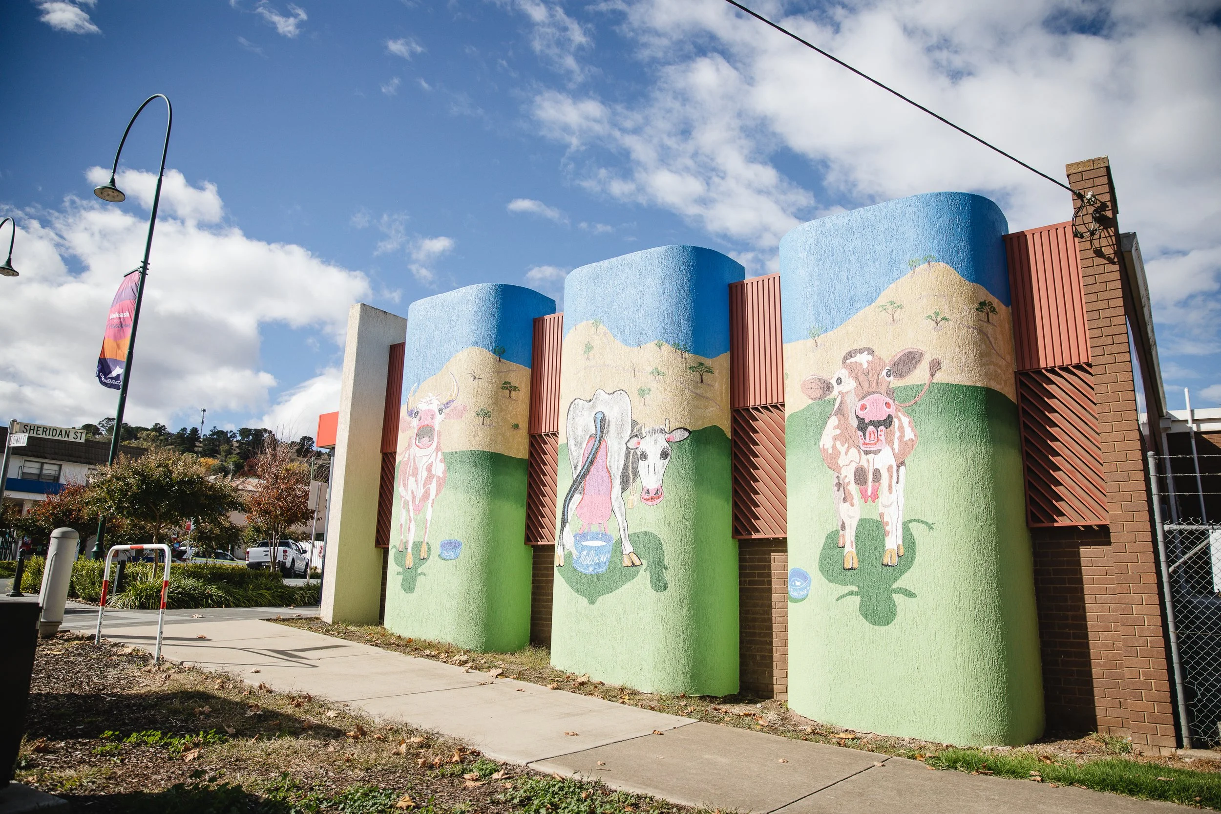 Erected in early 2021 by talented artist Yianni Johns. Depicting the story and history of Melba XV of Darbalara a local milking cow who became “the world’s champion butter-fat cow” in 1924.