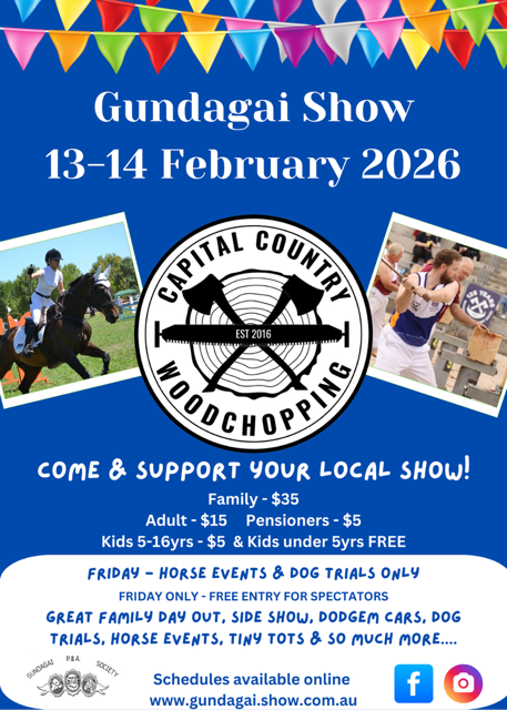 The Gundagai P&A Committee welcomes everyone to the 134th Annual Gundagai Show, a celebration of agriculture, entertainment and strong community spirit. Enjoy two massive days featuring cattle, horses, poultry, pavilion exhibits, working dogs, show dogs, vintage displays, sideshow alley and show bags.